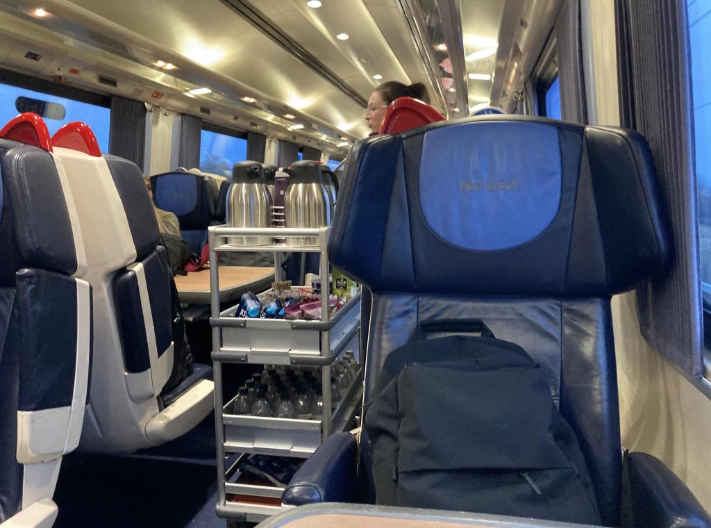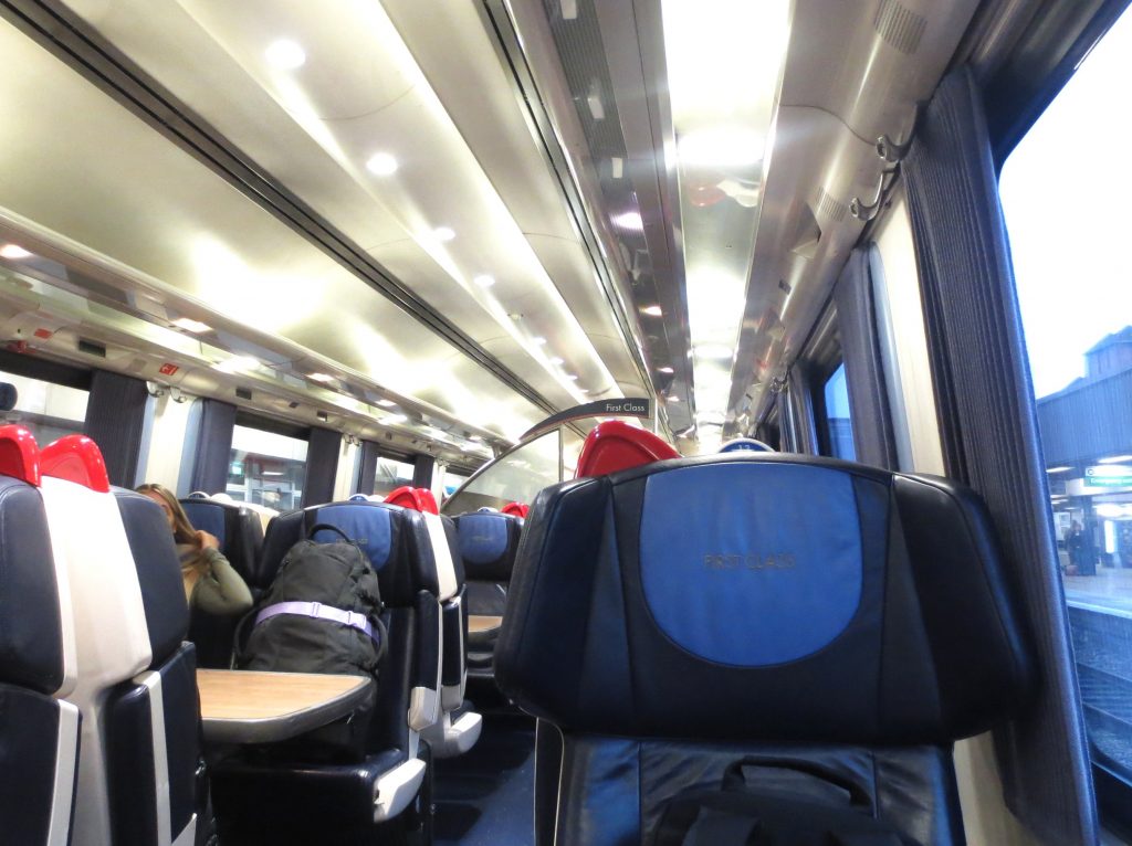 イギリスの1等は例によって、ドリンクや軽食等のサービスがあり、車内をこのようにワゴンが巡回してきます。スタッフにドリンクやスナックなど好きなものを頼めます。