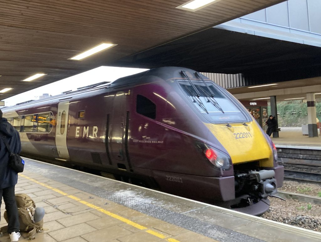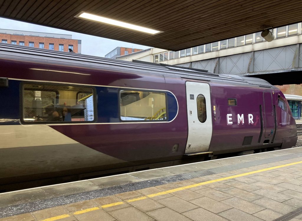 EMRの車両はイメージカラーのちょっと深みのあるパープルにペイントされています。なお上の画像は従来からの主力車両のMeridian(Class 222)ですが、ちょうど今月(2025年12月)から日立製の新型車両Aurora(Class810)も導入されています。
